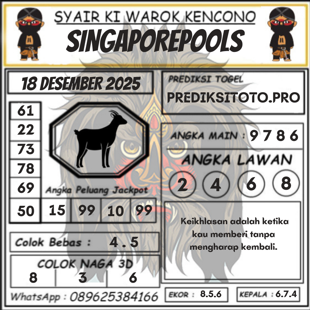 Syair togel Singapore akan tersurat dalam tiap kalimatnya untuk keluarkan prediksi angka pada togel singapore yang nanti akan ada. Syair-syair togel singapore umumnya mempunyai banyak arti tersembunyi dan jadi teka teki berkenaan angka yang dapat di definisikan oleh pembacanya atau pemain togel singapore. Ada cara-cara yang dapat kita kerjakan dalam langkah menerka makna dalam prediksi syair togel Singapore untuk menjadi angka prediksi kita. Yok langsung kita mencari tahu di bawah ini.