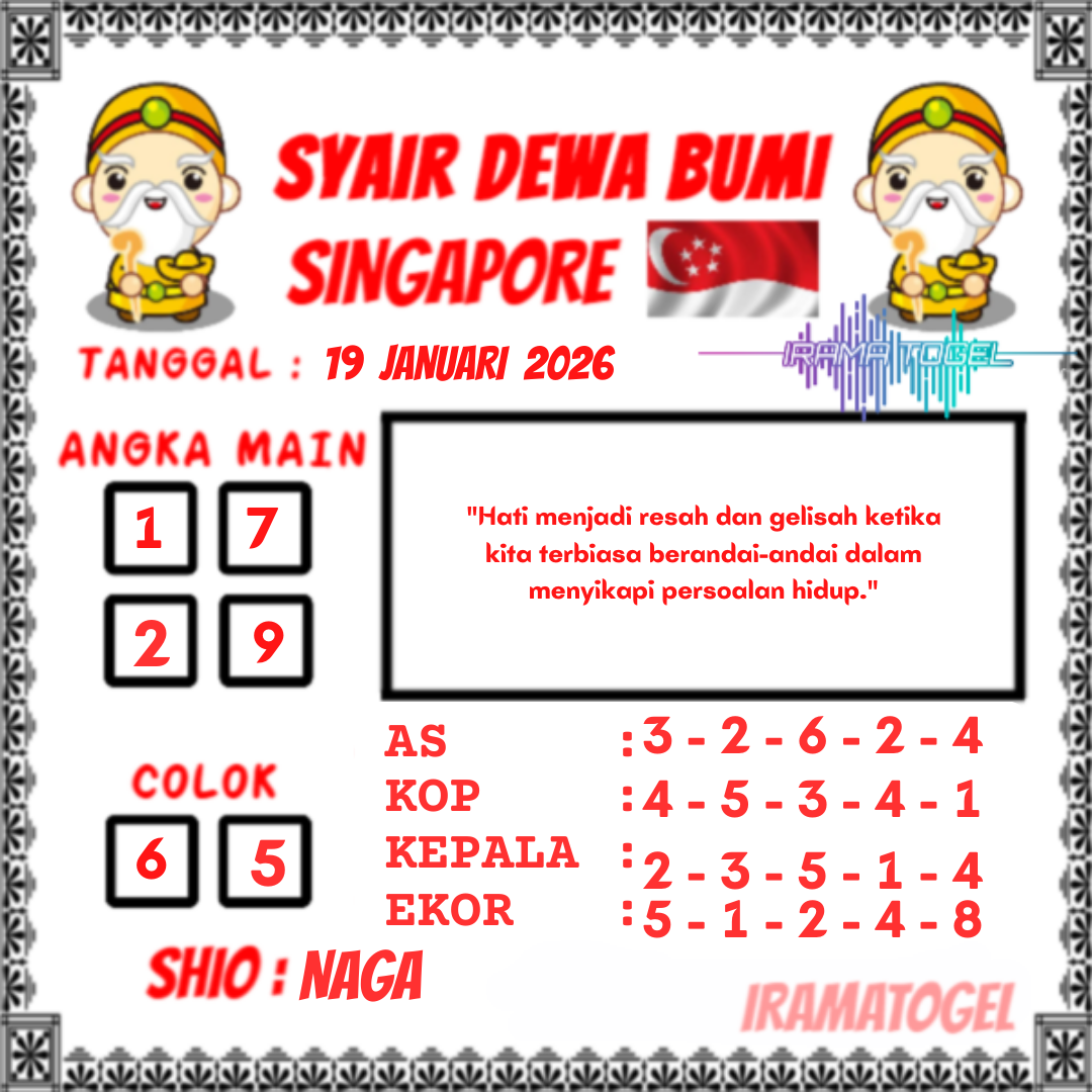 Syair togel Singapore akan tersurat dalam tiap kalimatnya untuk keluarkan prediksi angka pada togel singapore yang nanti akan ada. Syair-syair togel singapore umumnya mempunyai banyak arti tersembunyi dan jadi teka teki berkenaan angka yang dapat di definisikan oleh pembacanya atau pemain togel singapore. Ada cara-cara yang dapat kita kerjakan dalam langkah menerka makna dalam prediksi syair togel Singapore untuk menjadi angka prediksi kita. Yok langsung kita mencari tahu di bawah ini.