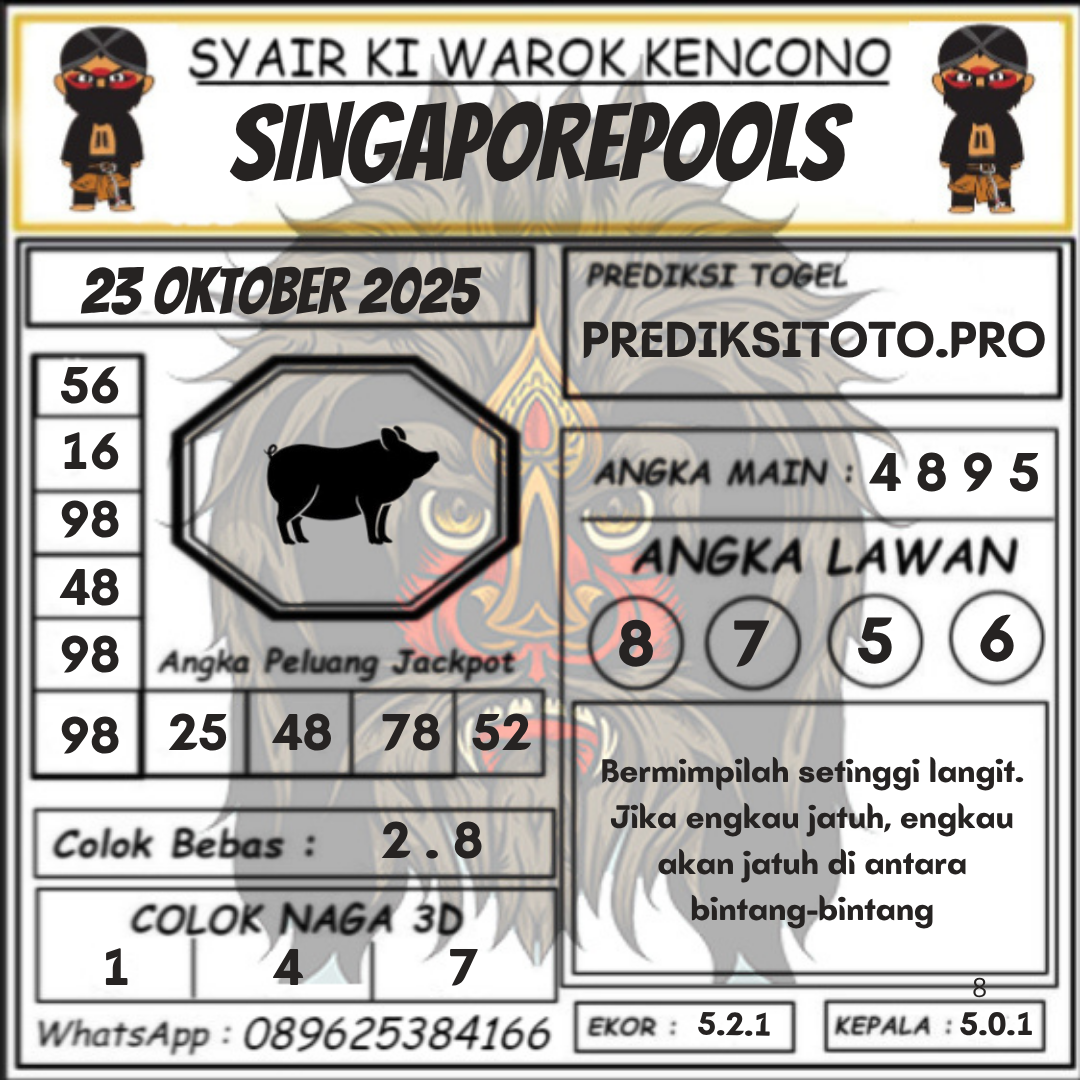 Syair togel Singapore akan tersurat dalam tiap kalimatnya untuk keluarkan prediksi angka pada togel singapore yang nanti akan ada. Syair-syair togel singapore umumnya mempunyai banyak arti tersembunyi dan jadi teka teki berkenaan angka yang dapat di definisikan oleh pembacanya atau pemain togel singapore. Ada cara-cara yang dapat kita kerjakan dalam langkah menerka makna dalam prediksi syair togel Singapore untuk menjadi angka prediksi kita. Yok langsung kita mencari tahu di bawah ini.
