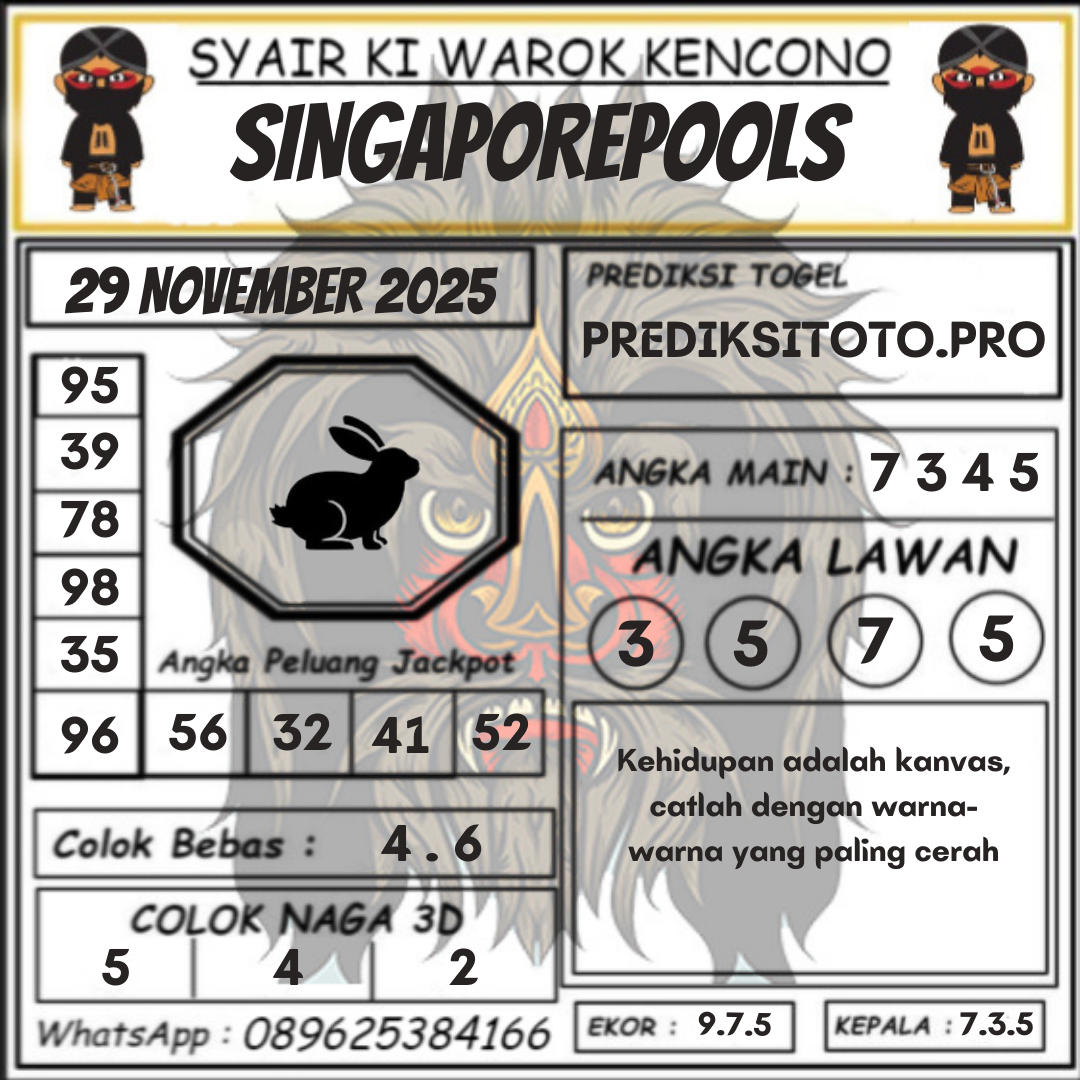 Syair togel Singapore akan tersurat dalam tiap kalimatnya untuk keluarkan prediksi angka pada togel singapore yang nanti akan ada. Syair-syair togel singapore umumnya mempunyai banyak arti tersembunyi dan jadi teka teki berkenaan angka yang dapat di definisikan oleh pembacanya atau pemain togel singapore. Ada cara-cara yang dapat kita kerjakan dalam langkah menerka makna dalam prediksi syair togel Singapore untuk menjadi angka prediksi kita. Yok langsung kita mencari tahu di bawah ini.