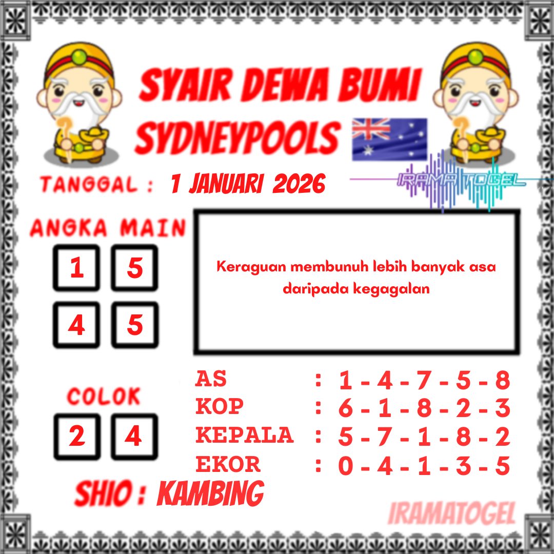 Para penggemar yang bermain judi togel online sydney, pastinya sudah memiliki trik sendiri untuk mendapatkan bocoran angka keluaran togel sydney hari ini. Jika anda senang bermain togel menggunakan data prediksi togel maka kamu bisa mengandalkanya dengan melihat syair togel sydney di IramaTogel. Kami selaku bandar judi togel online resmi dan terbesar telah menyediakan syair togel sydney yang benar-benar akurat dan jitu. Selain pasaran togel sydney, IramaTogel juga sudah menyiapkan pasaran togel terbesar lainnya yang bisa anda lihat disini.