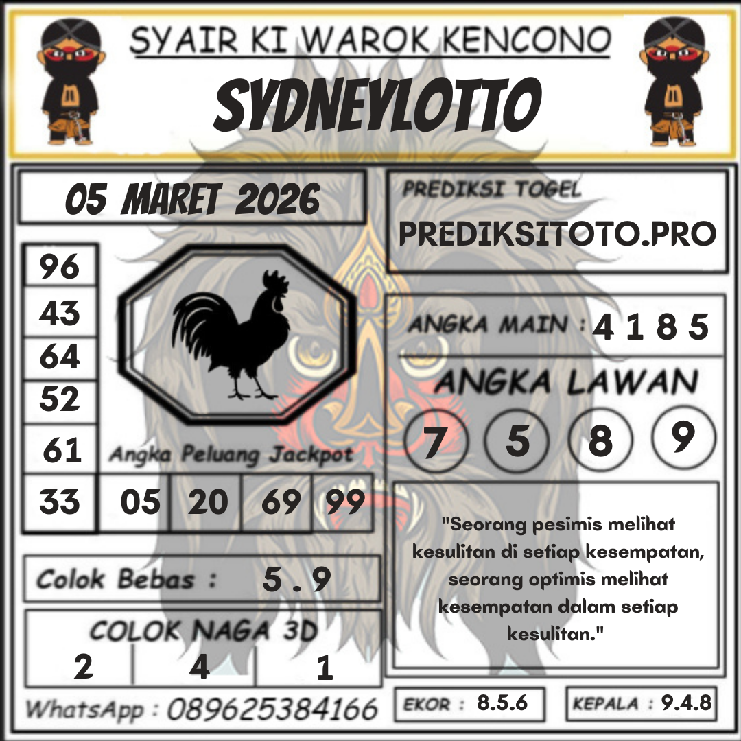 Syair togel Sydney akan tersurat dalam tiap kalimatnya untuk keluarkan prediksi angka pada togel sydney yang nanti akan ada. Syair-syair togel sydney umumnya mempunyai banyak arti tersembunyi dan jadi teka teki berkenaan angka yang dapat di definisikan oleh pembacanya atau pemain togel sydney. Ada cara-cara yang dapat kita kerjakan dalam langkah menerka makna dalam prediksi syair togel Sydney untuk menjadi angka prediksi kita. Yok langsung kita mencari tahu di bawah ini.