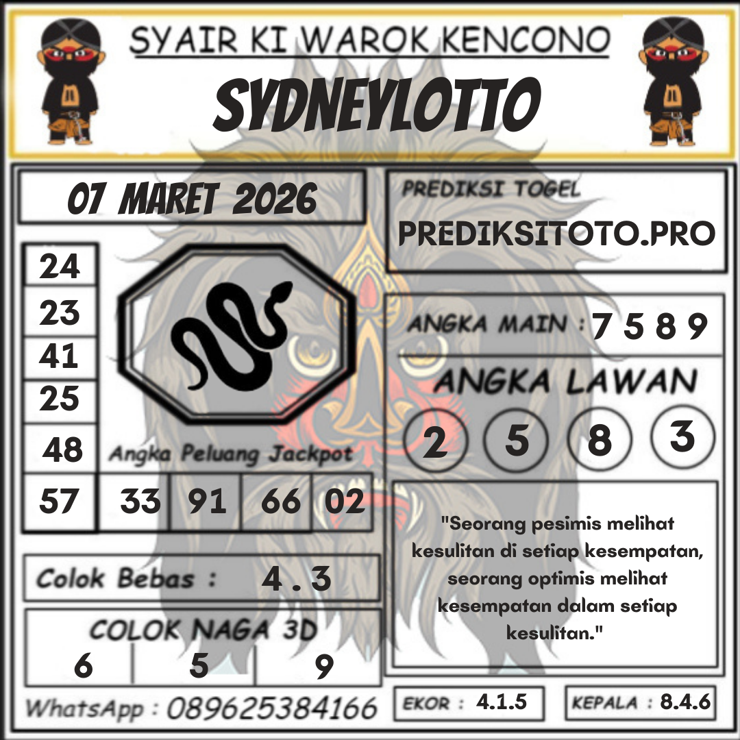 Syair togel Sydney akan tersurat dalam tiap kalimatnya untuk keluarkan prediksi angka pada togel sydney yang nanti akan ada. Syair-syair togel sydney umumnya mempunyai banyak arti tersembunyi dan jadi teka teki berkenaan angka yang dapat di definisikan oleh pembacanya atau pemain togel sydney. Ada cara-cara yang dapat kita kerjakan dalam langkah menerka makna dalam prediksi syair togel Sydney untuk menjadi angka prediksi kita. Yok langsung kita mencari tahu di bawah ini.