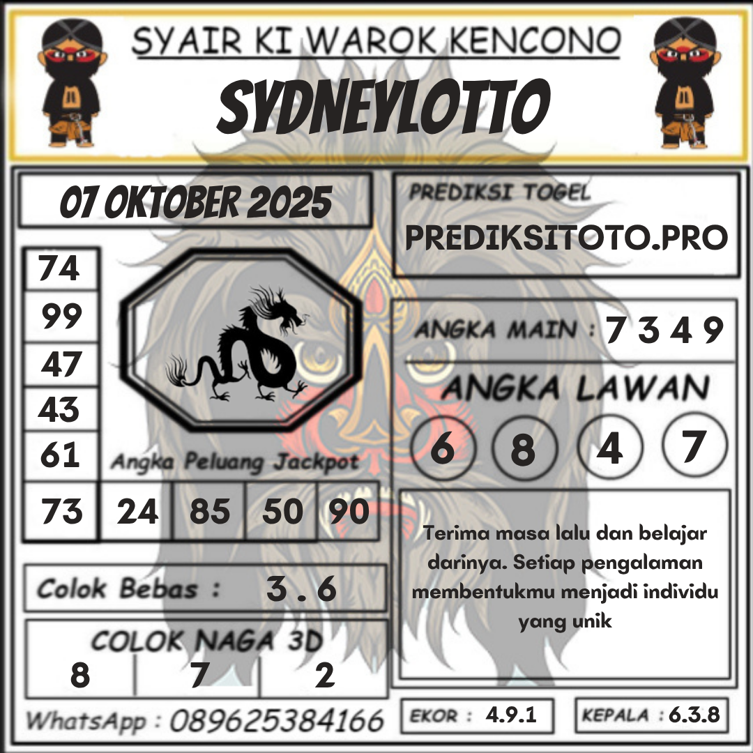 Syair togel Sydney akan tersurat dalam tiap kalimatnya untuk keluarkan prediksi angka pada togel sydney yang nanti akan ada. Syair-syair togel sydney umumnya mempunyai banyak arti tersembunyi dan jadi teka teki berkenaan angka yang dapat di definisikan oleh pembacanya atau pemain togel sydney. Ada cara-cara yang dapat kita kerjakan dalam langkah menerka makna dalam prediksi syair togel Sydney untuk menjadi angka prediksi kita. Yok langsung kita mencari tahu di bawah ini.