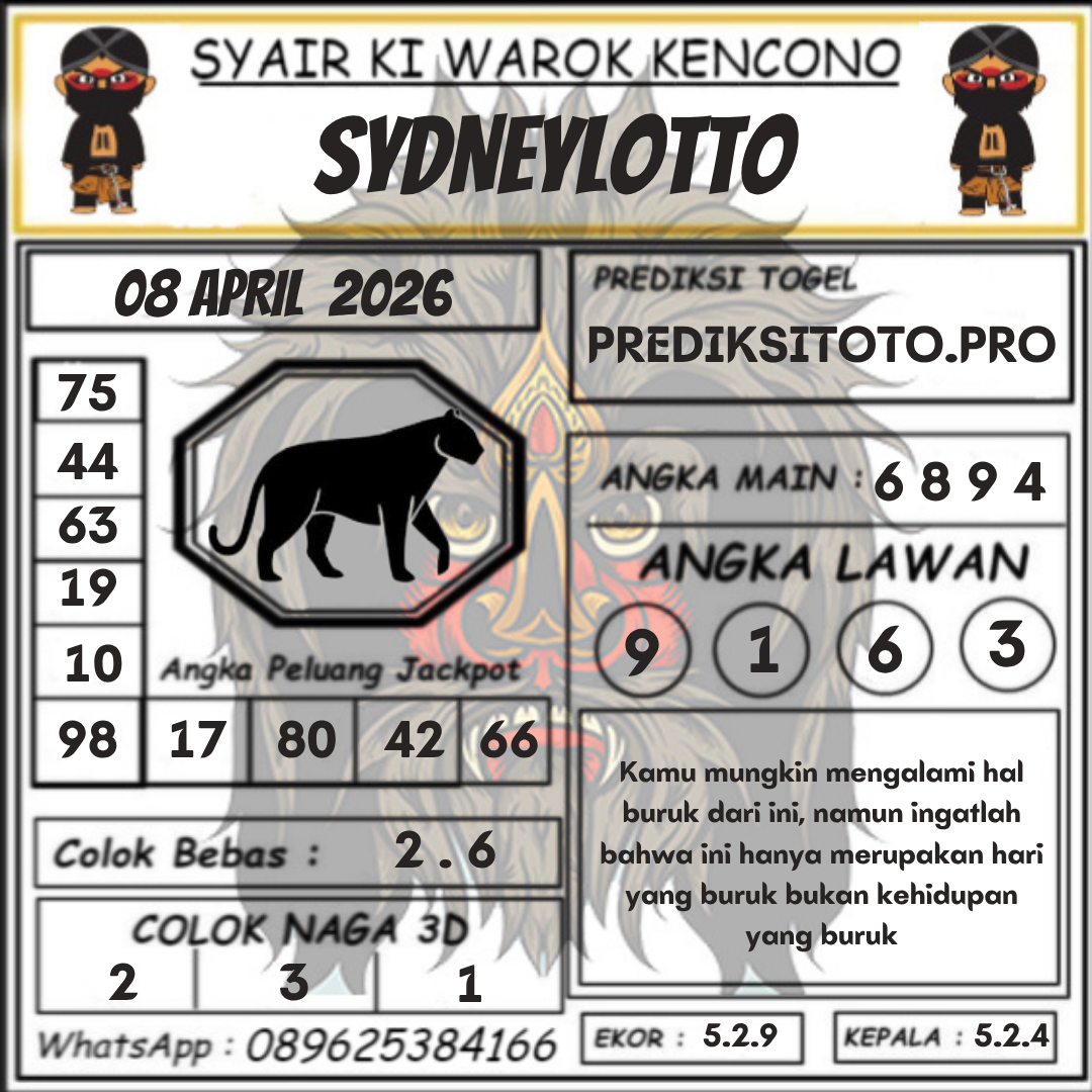 Syair togel Sydney akan tersurat dalam tiap kalimatnya untuk keluarkan prediksi angka pada togel sydney yang nanti akan ada. Syair-syair togel sydney umumnya mempunyai banyak arti tersembunyi dan jadi teka teki berkenaan angka yang dapat di definisikan oleh pembacanya atau pemain togel sydney. Ada cara-cara yang dapat kita kerjakan dalam langkah menerka makna dalam prediksi syair togel Sydney untuk menjadi angka prediksi kita. Yok langsung kita mencari tahu di bawah ini.