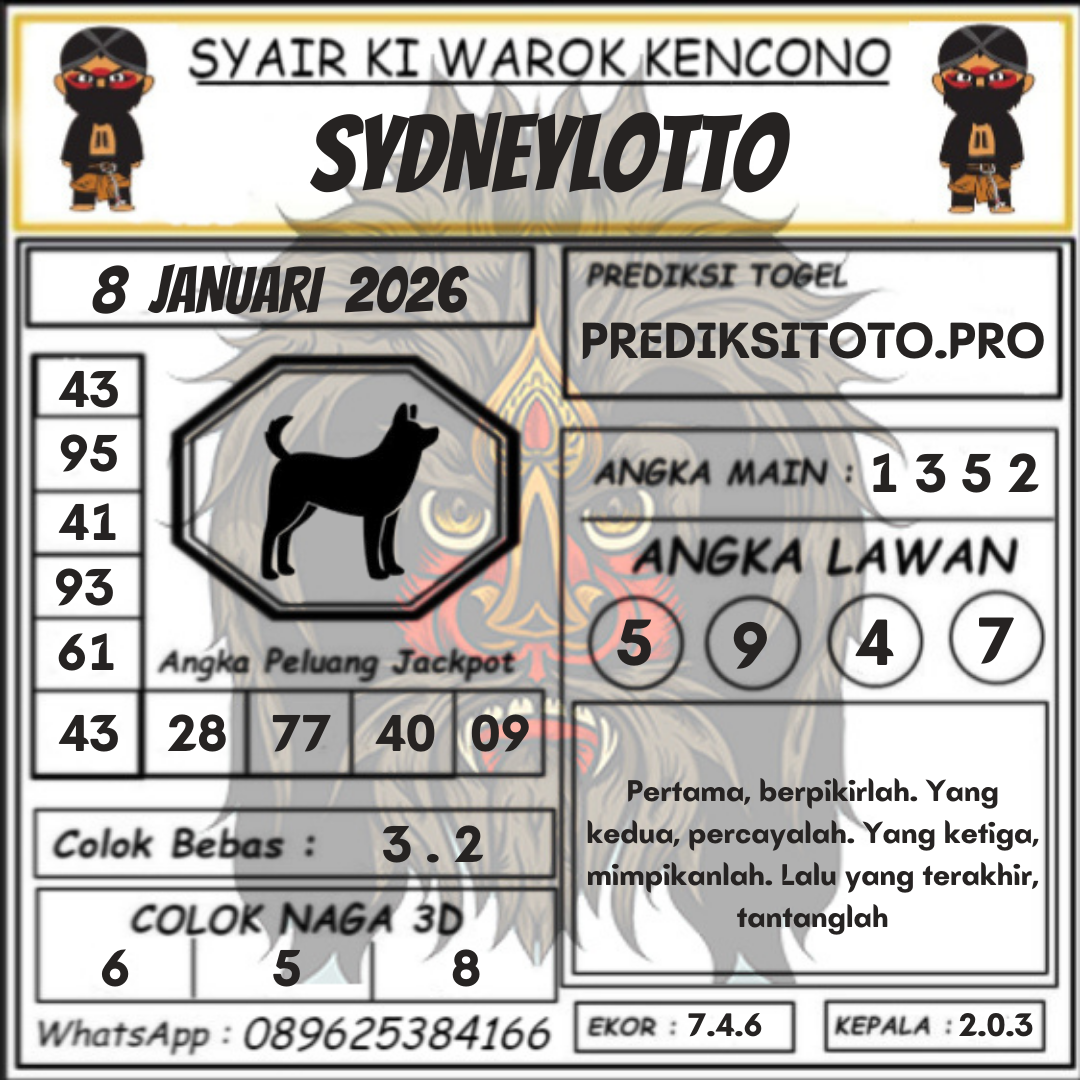 Syair togel Sydney akan tersurat dalam tiap kalimatnya untuk keluarkan prediksi angka pada togel sydney yang nanti akan ada. Syair-syair togel sydney umumnya mempunyai banyak arti tersembunyi dan jadi teka teki berkenaan angka yang dapat di definisikan oleh pembacanya atau pemain togel sydney. Ada cara-cara yang dapat kita kerjakan dalam langkah menerka makna dalam prediksi syair togel Sydney untuk menjadi angka prediksi kita. Yok langsung kita mencari tahu di bawah ini.