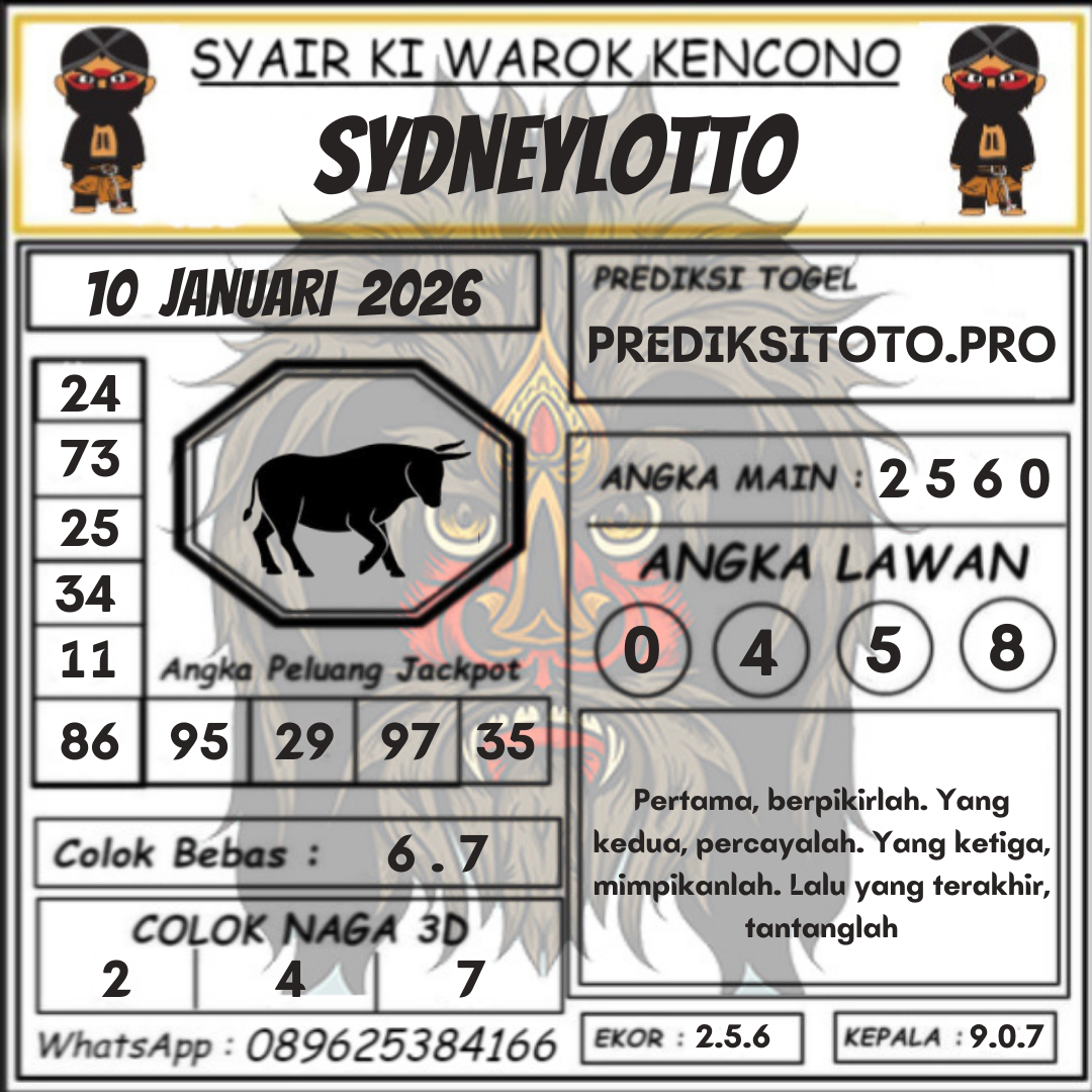 Syair togel Sydney akan tersurat dalam tiap kalimatnya untuk keluarkan prediksi angka pada togel sydney yang nanti akan ada. Syair-syair togel sydney umumnya mempunyai banyak arti tersembunyi dan jadi teka teki berkenaan angka yang dapat di definisikan oleh pembacanya atau pemain togel sydney. Ada cara-cara yang dapat kita kerjakan dalam langkah menerka makna dalam prediksi syair togel Sydney untuk menjadi angka prediksi kita. Yok langsung kita mencari tahu di bawah ini.