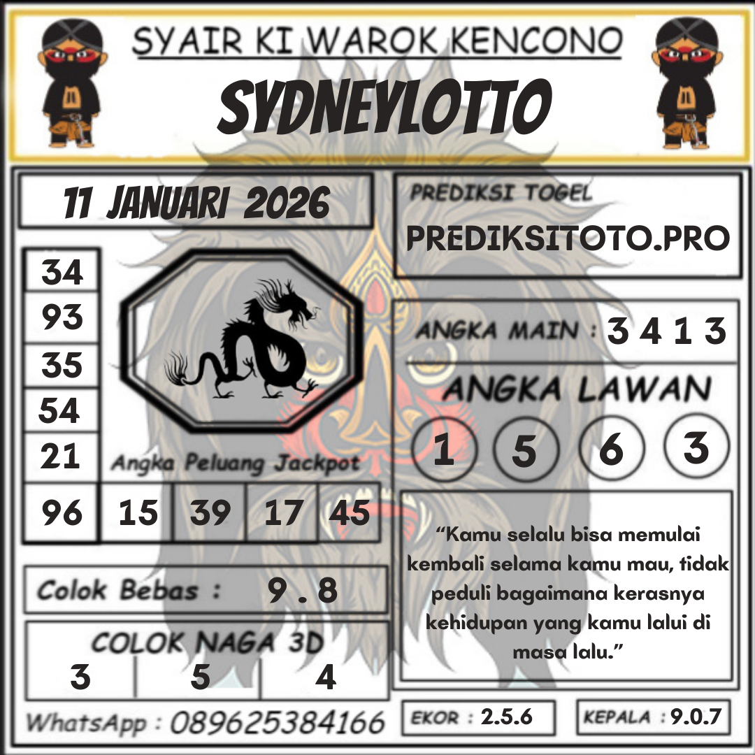 Syair togel Sydney akan tersurat dalam tiap kalimatnya untuk keluarkan prediksi angka pada togel sydney yang nanti akan ada. Syair-syair togel sydney umumnya mempunyai banyak arti tersembunyi dan jadi teka teki berkenaan angka yang dapat di definisikan oleh pembacanya atau pemain togel sydney. Ada cara-cara yang dapat kita kerjakan dalam langkah menerka makna dalam prediksi syair togel Sydney untuk menjadi angka prediksi kita. Yok langsung kita mencari tahu di bawah ini.