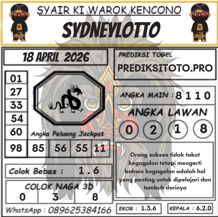 Syair togel Sydney akan tersurat dalam tiap kalimatnya untuk keluarkan prediksi angka pada togel sydney yang nanti akan ada. Syair-syair togel sydney umumnya mempunyai banyak arti tersembunyi dan jadi teka teki berkenaan angka yang dapat di definisikan oleh pembacanya atau pemain togel sydney. Ada cara-cara yang dapat kita kerjakan dalam langkah menerka makna dalam prediksi syair togel Sydney untuk menjadi angka prediksi kita. Yok langsung kita mencari tahu di bawah ini.