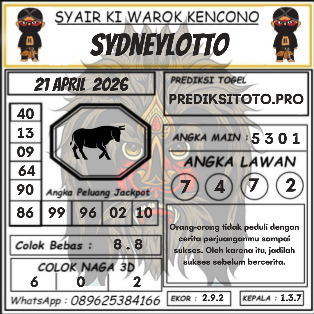 Syair togel Sydney akan tersurat dalam tiap kalimatnya untuk keluarkan prediksi angka pada togel sydney yang nanti akan ada. Syair-syair togel sydney umumnya mempunyai banyak arti tersembunyi dan jadi teka teki berkenaan angka yang dapat di definisikan oleh pembacanya atau pemain togel sydney. Ada cara-cara yang dapat kita kerjakan dalam langkah menerka makna dalam prediksi syair togel Sydney untuk menjadi angka prediksi kita. Yok langsung kita mencari tahu di bawah ini.