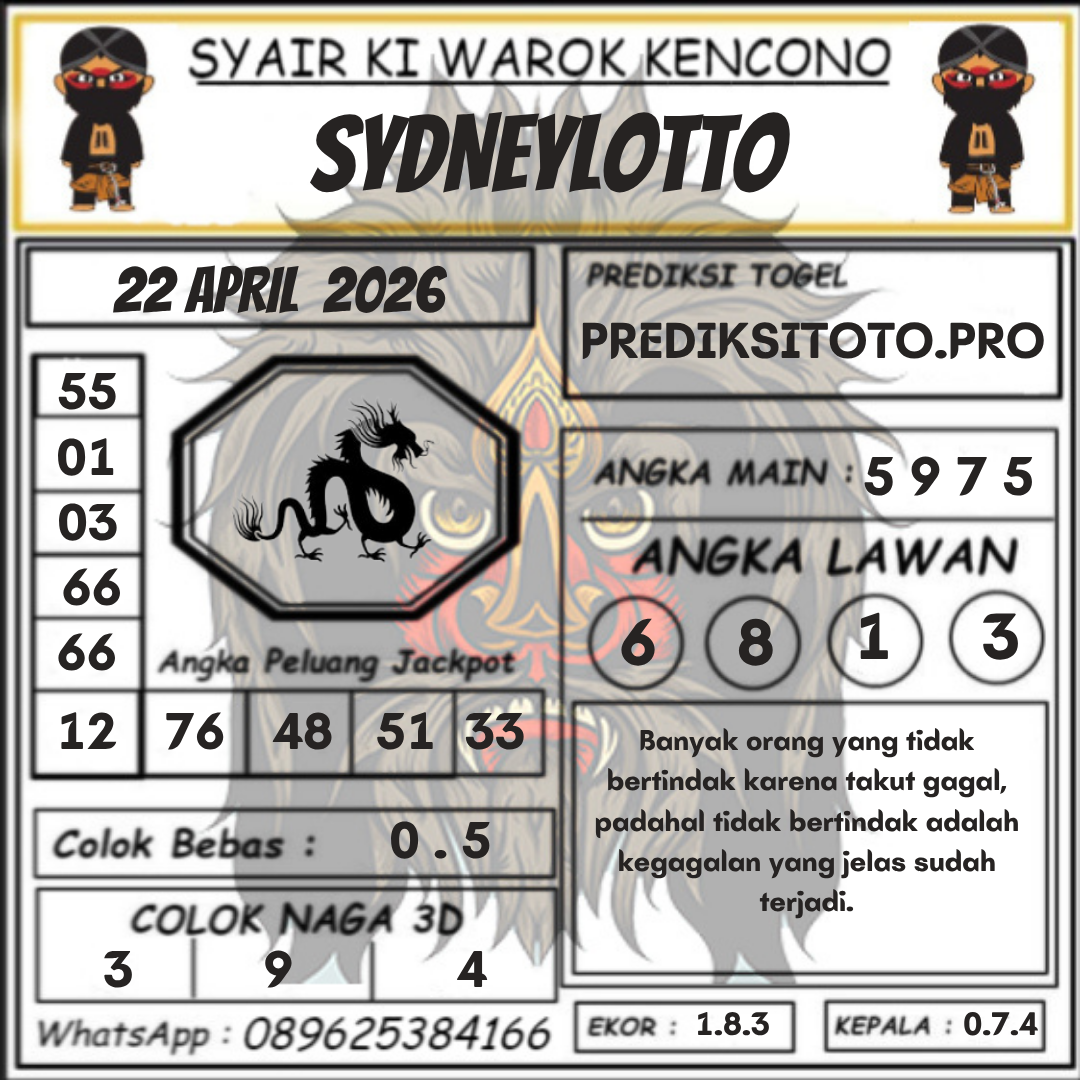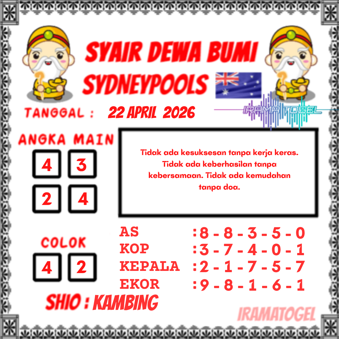 Syair togel Sydney akan tersurat dalam tiap kalimatnya untuk keluarkan prediksi angka pada togel sydney yang nanti akan ada. Syair-syair togel sydney umumnya mempunyai banyak arti tersembunyi dan jadi teka teki berkenaan angka yang dapat di definisikan oleh pembacanya atau pemain togel sydney. Ada cara-cara yang dapat kita kerjakan dalam langkah menerka makna dalam prediksi syair togel Sydney untuk menjadi angka prediksi kita. Yok langsung kita mencari tahu di bawah ini.