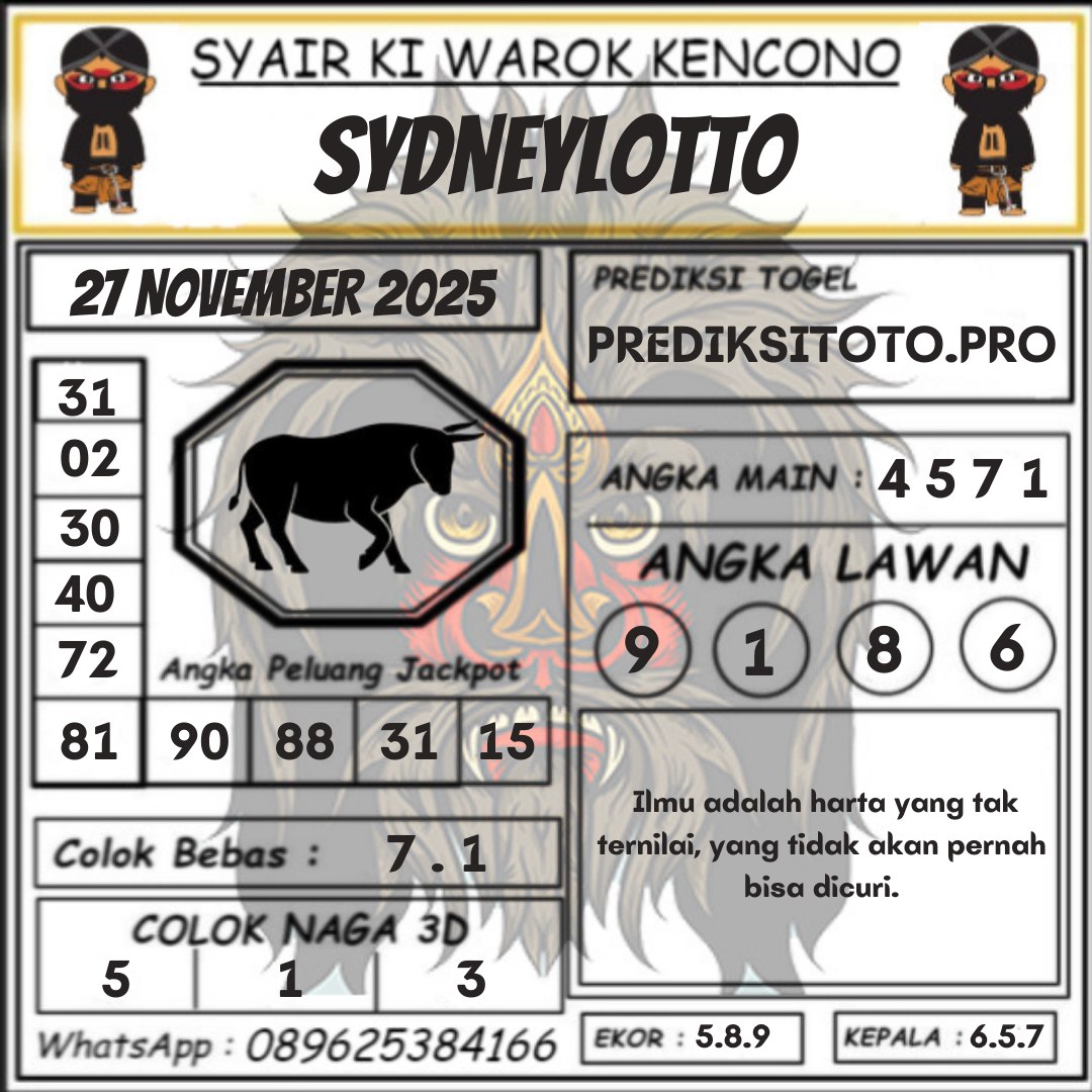Syair togel Sydney akan tersurat dalam tiap kalimatnya untuk keluarkan prediksi angka pada togel sydney yang nanti akan ada. Syair-syair togel sydney umumnya mempunyai banyak arti tersembunyi dan jadi teka teki berkenaan angka yang dapat di definisikan oleh pembacanya atau pemain togel sydney. Ada cara-cara yang dapat kita kerjakan dalam langkah menerka makna dalam prediksi syair togel Sydney untuk menjadi angka prediksi kita. Yok langsung kita mencari tahu di bawah ini.