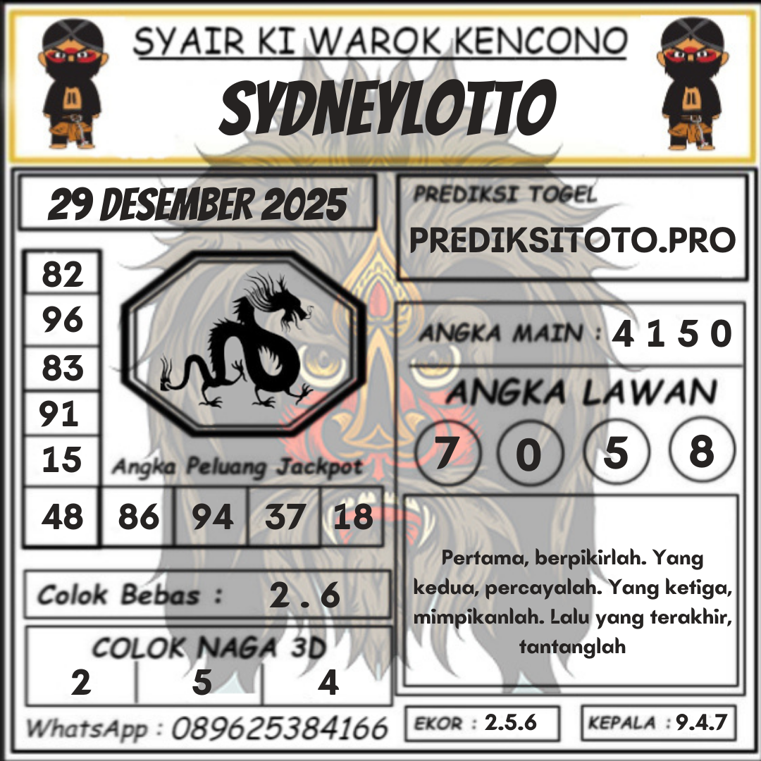 Syair togel Sydney akan tersurat dalam tiap kalimatnya untuk keluarkan prediksi angka pada togel sydney yang nanti akan ada. Syair-syair togel sydney umumnya mempunyai banyak arti tersembunyi dan jadi teka teki berkenaan angka yang dapat di definisikan oleh pembacanya atau pemain togel sydney. Ada cara-cara yang dapat kita kerjakan dalam langkah menerka makna dalam prediksi syair togel Sydney untuk menjadi angka prediksi kita. Yok langsung kita mencari tahu di bawah ini.