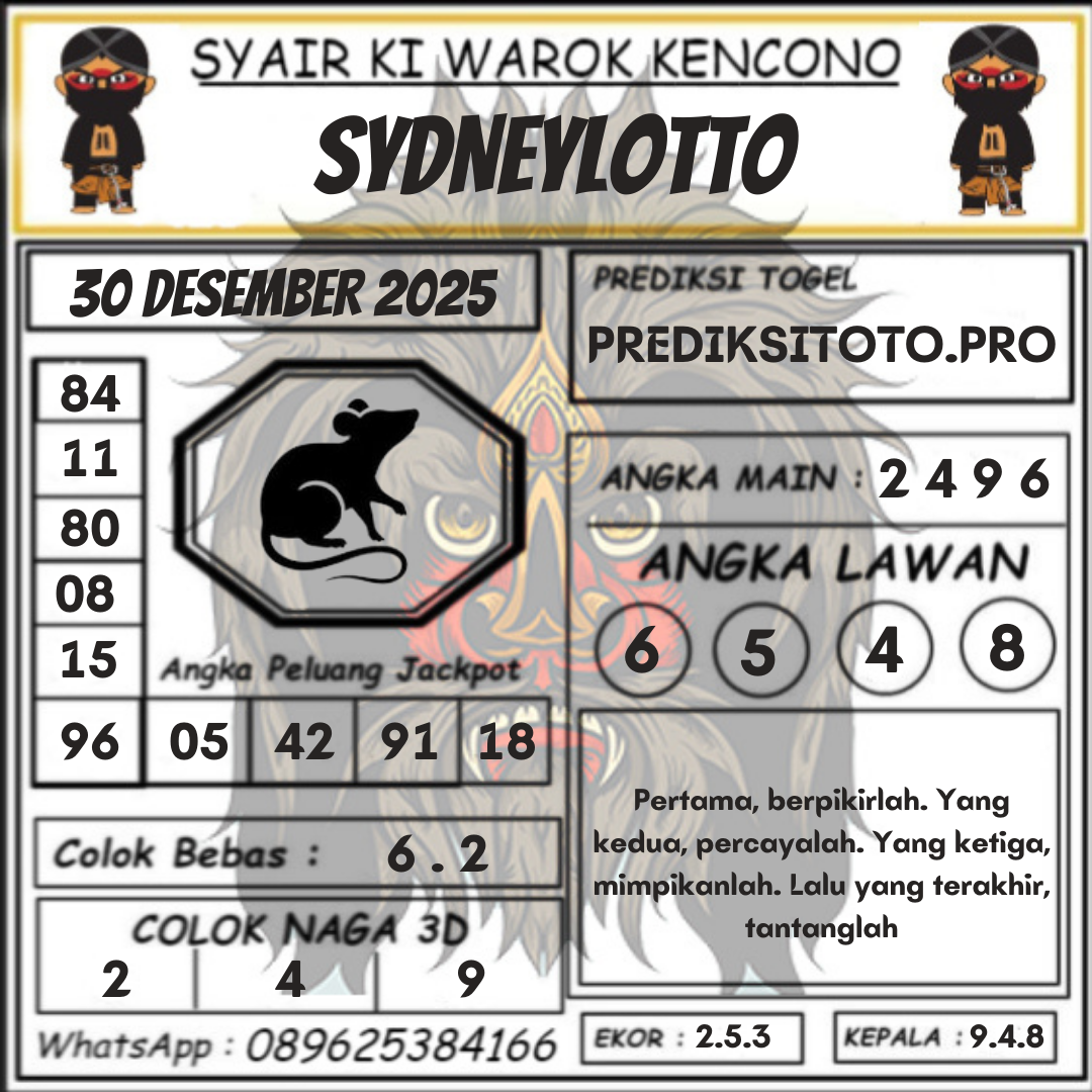 Syair togel Sydney akan tersurat dalam tiap kalimatnya untuk keluarkan prediksi angka pada togel sydney yang nanti akan ada. Syair-syair togel sydney umumnya mempunyai banyak arti tersembunyi dan jadi teka teki berkenaan angka yang dapat di definisikan oleh pembacanya atau pemain togel sydney. Ada cara-cara yang dapat kita kerjakan dalam langkah menerka makna dalam prediksi syair togel Sydney untuk menjadi angka prediksi kita. Yok langsung kita mencari tahu di bawah ini.