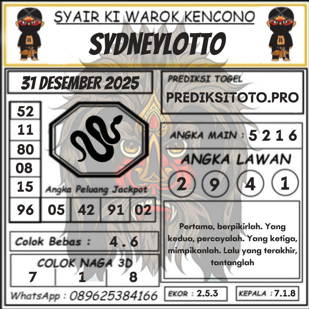 Syair togel Sydney akan tersurat dalam tiap kalimatnya untuk keluarkan prediksi angka pada togel sydney yang nanti akan ada. Syair-syair togel sydney umumnya mempunyai banyak arti tersembunyi dan jadi teka teki berkenaan angka yang dapat di definisikan oleh pembacanya atau pemain togel sydney. Ada cara-cara yang dapat kita kerjakan dalam langkah menerka makna dalam prediksi syair togel Sydney untuk menjadi angka prediksi kita. Yok langsung kita mencari tahu di bawah ini.